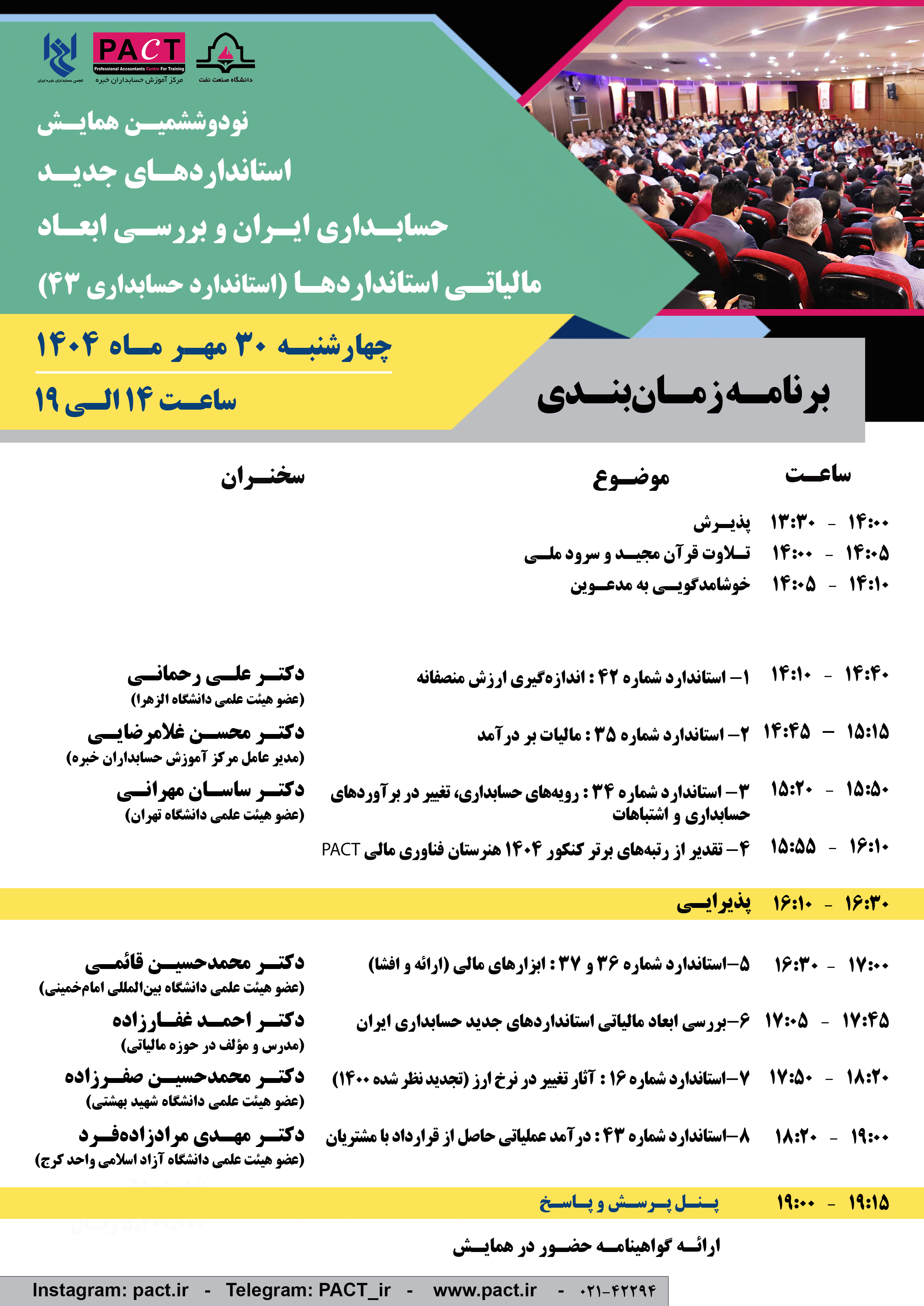 برنامه زمانبندی نودوششمین همایش حضوری استانداردهای جدید حسابداری ایران و بررسی ابعاد مالیاتی استانداردها